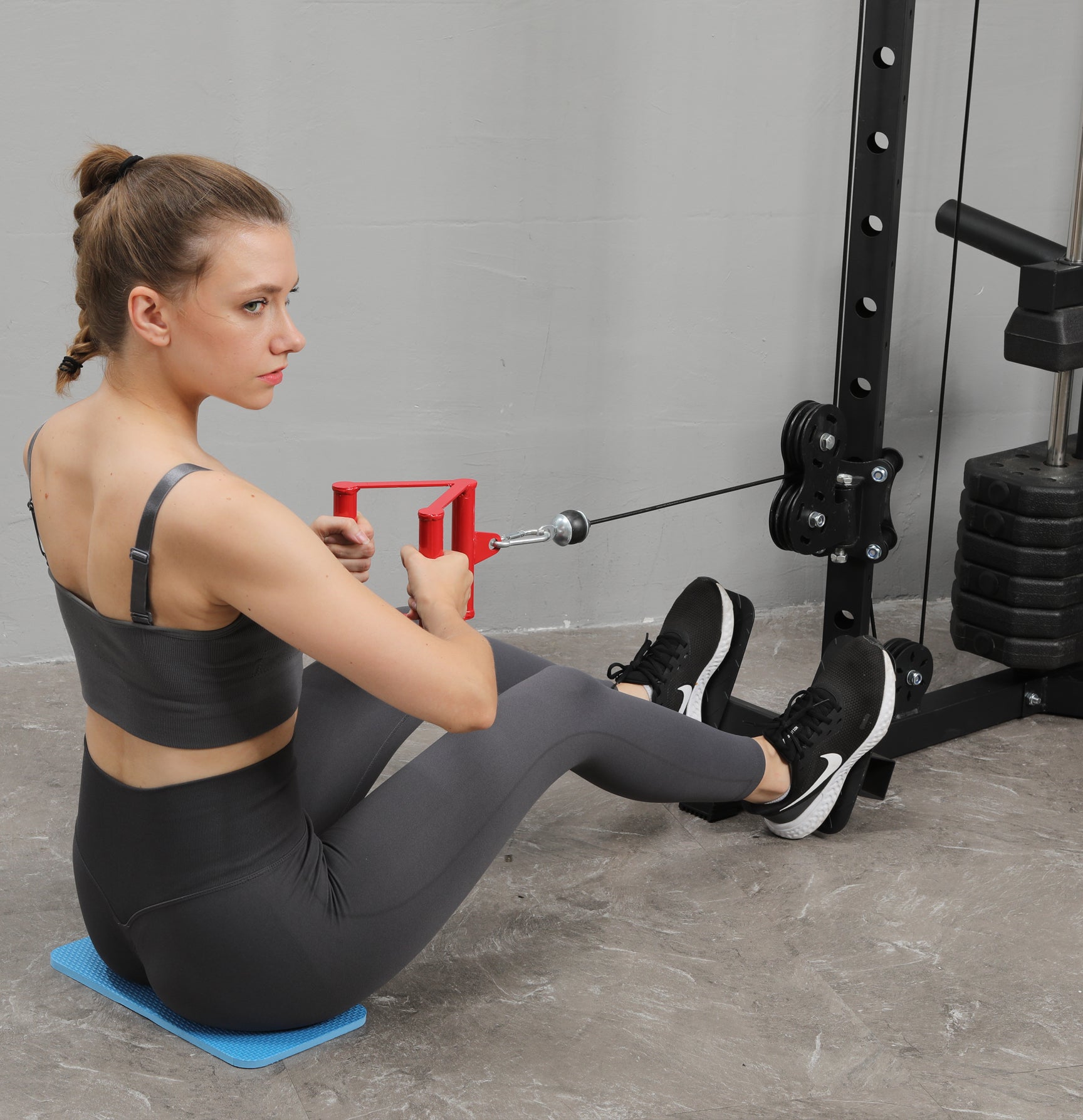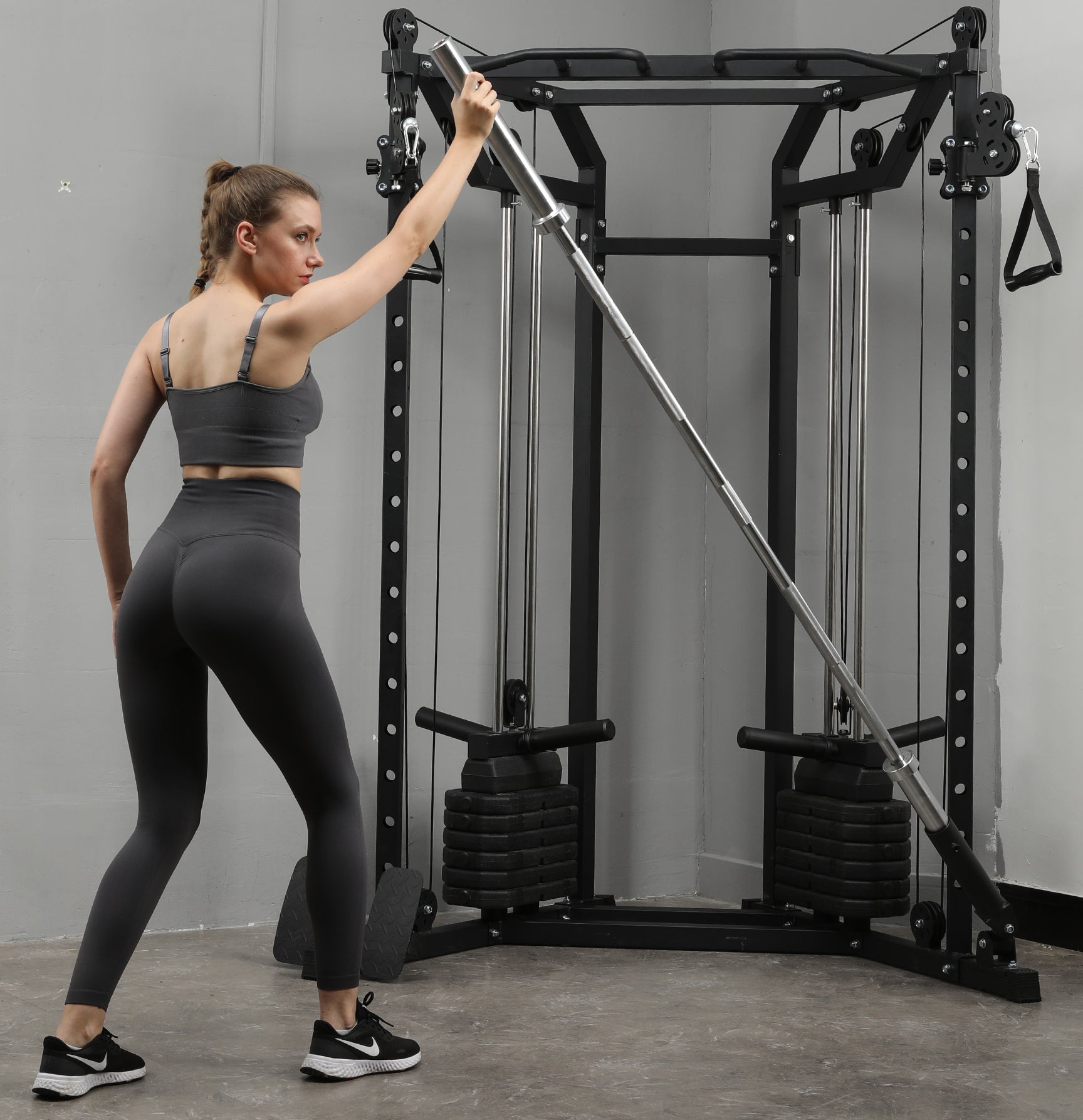 Move the pulley to the lower level to perform a variety of exercises such as bicep curls, seated rows, and more. This setup allows smooth, controlled movements to effectively target your arms, back, and core muscles for a complete strength workout.