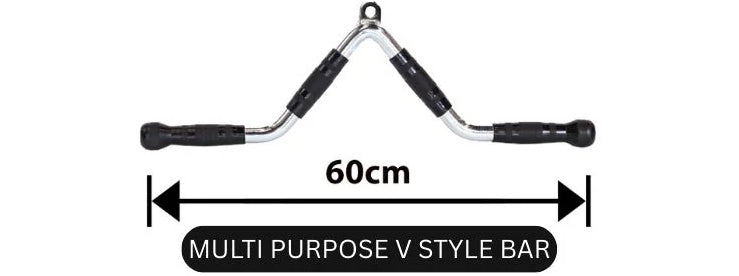 60 cm V style cable bar for rows, pulldowns, and triceps work with a comfortable neutral grip.