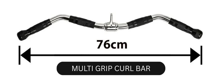 Compact, durable curl bar with multiple grip positions to perform bicep and tricep workouts.