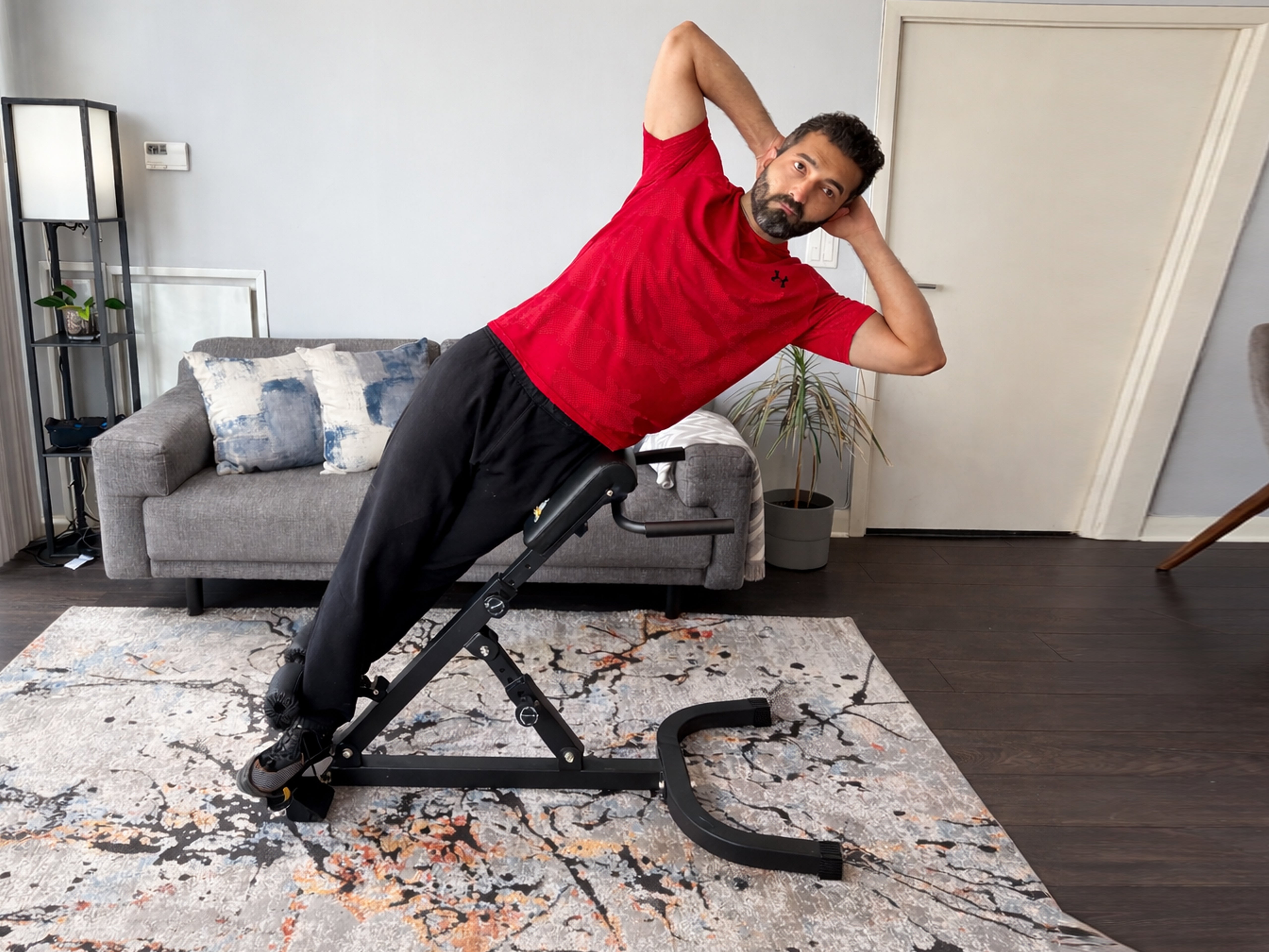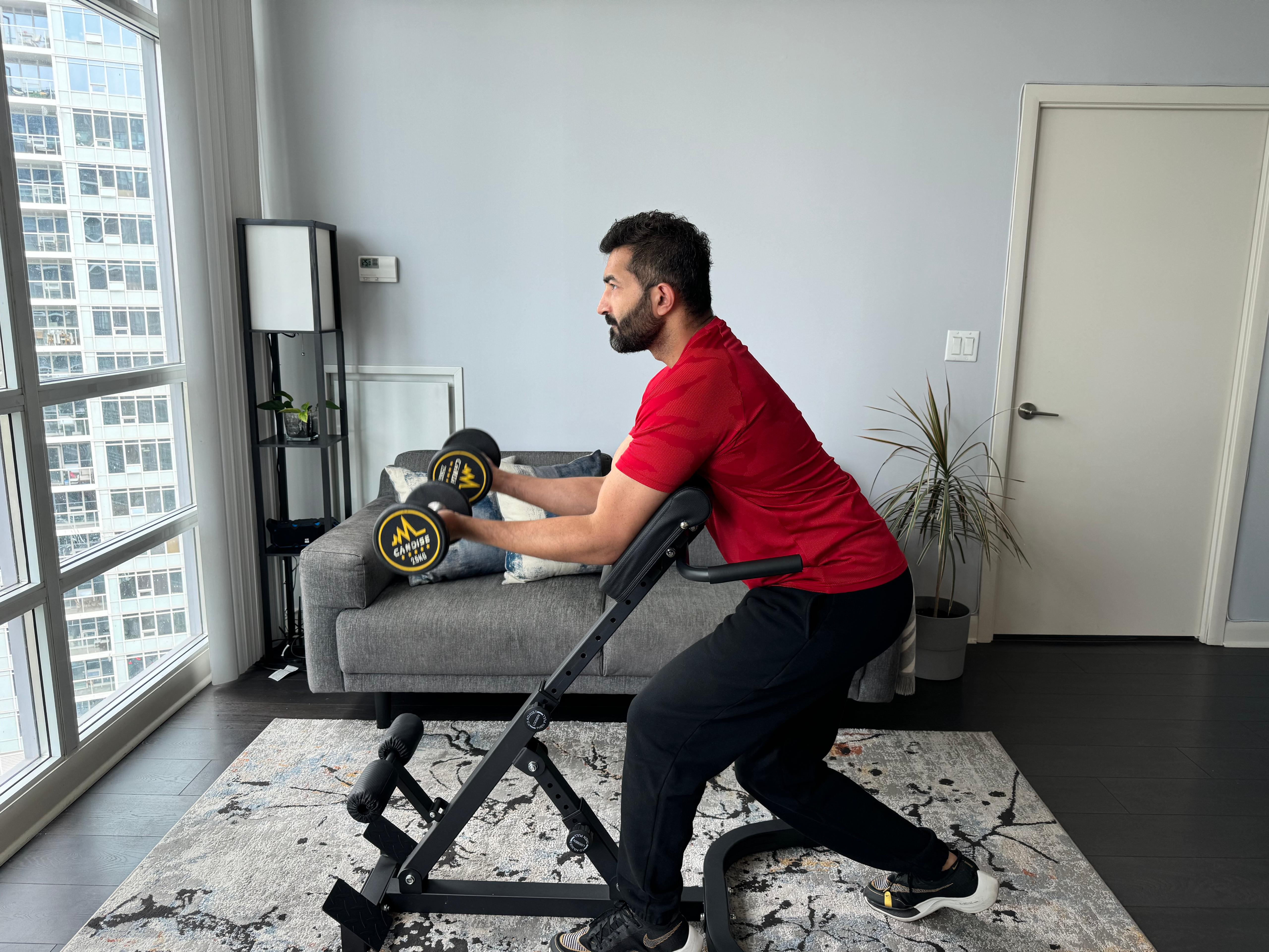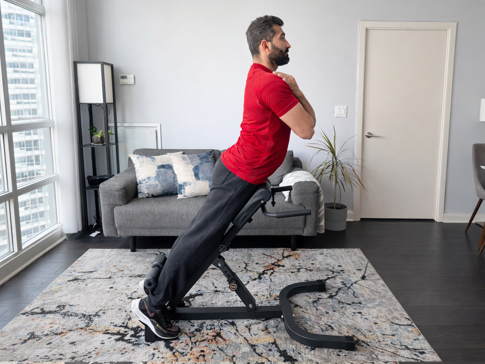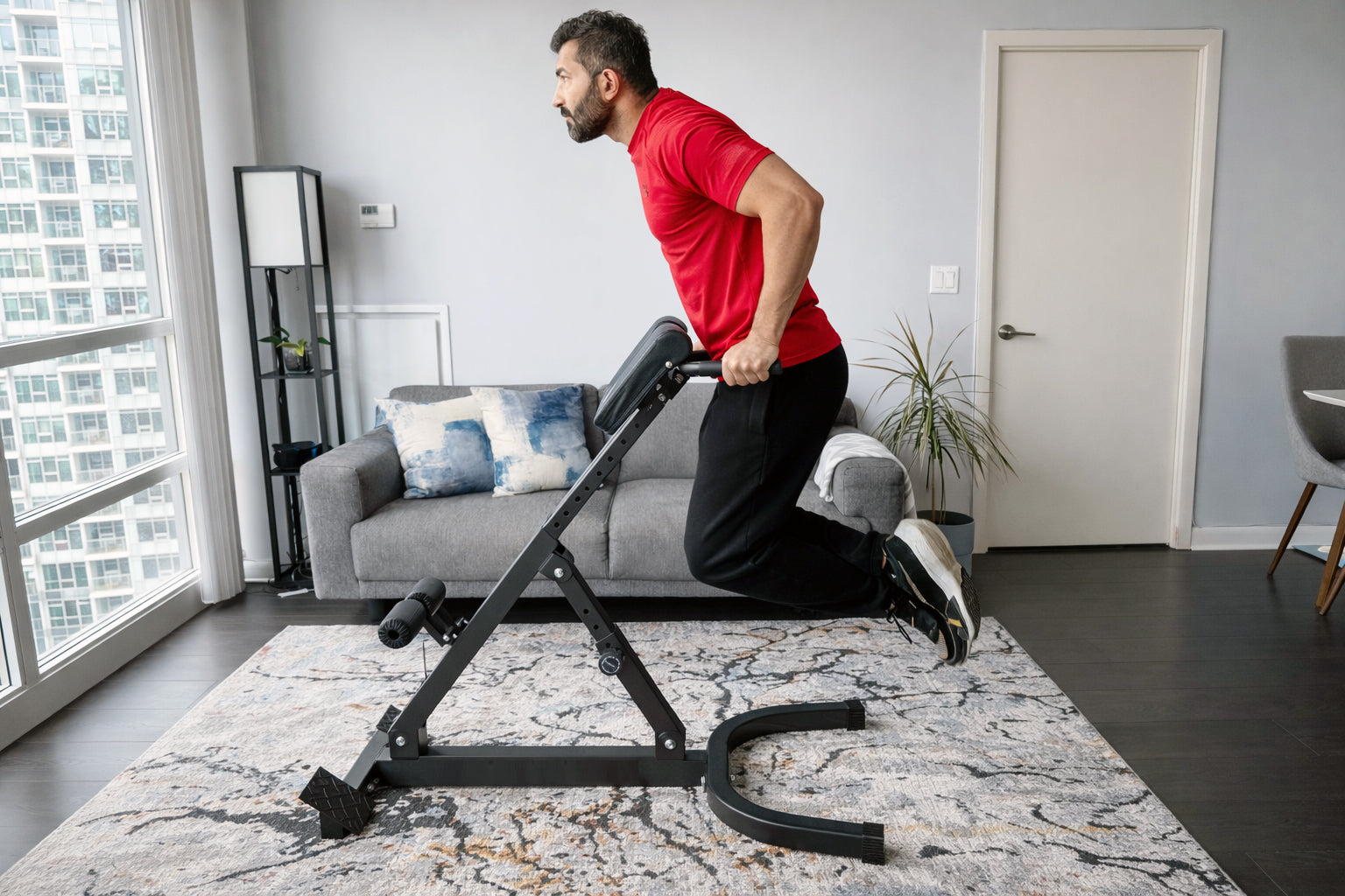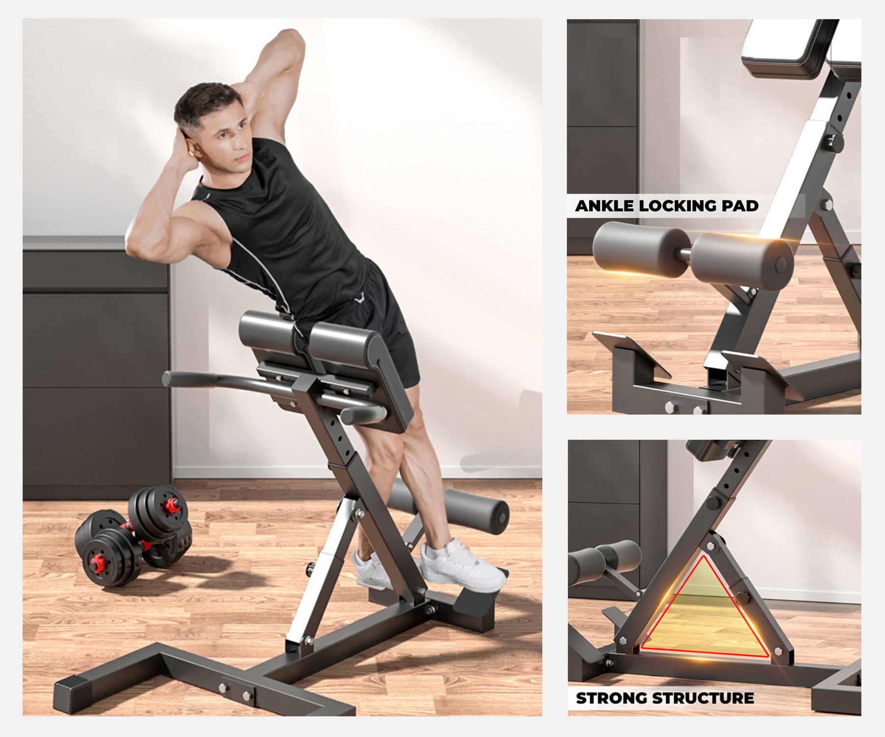 The hyperextension bench features a quick-fold design that allows easy storage when not in use, making it perfect for home gyms with limited space.