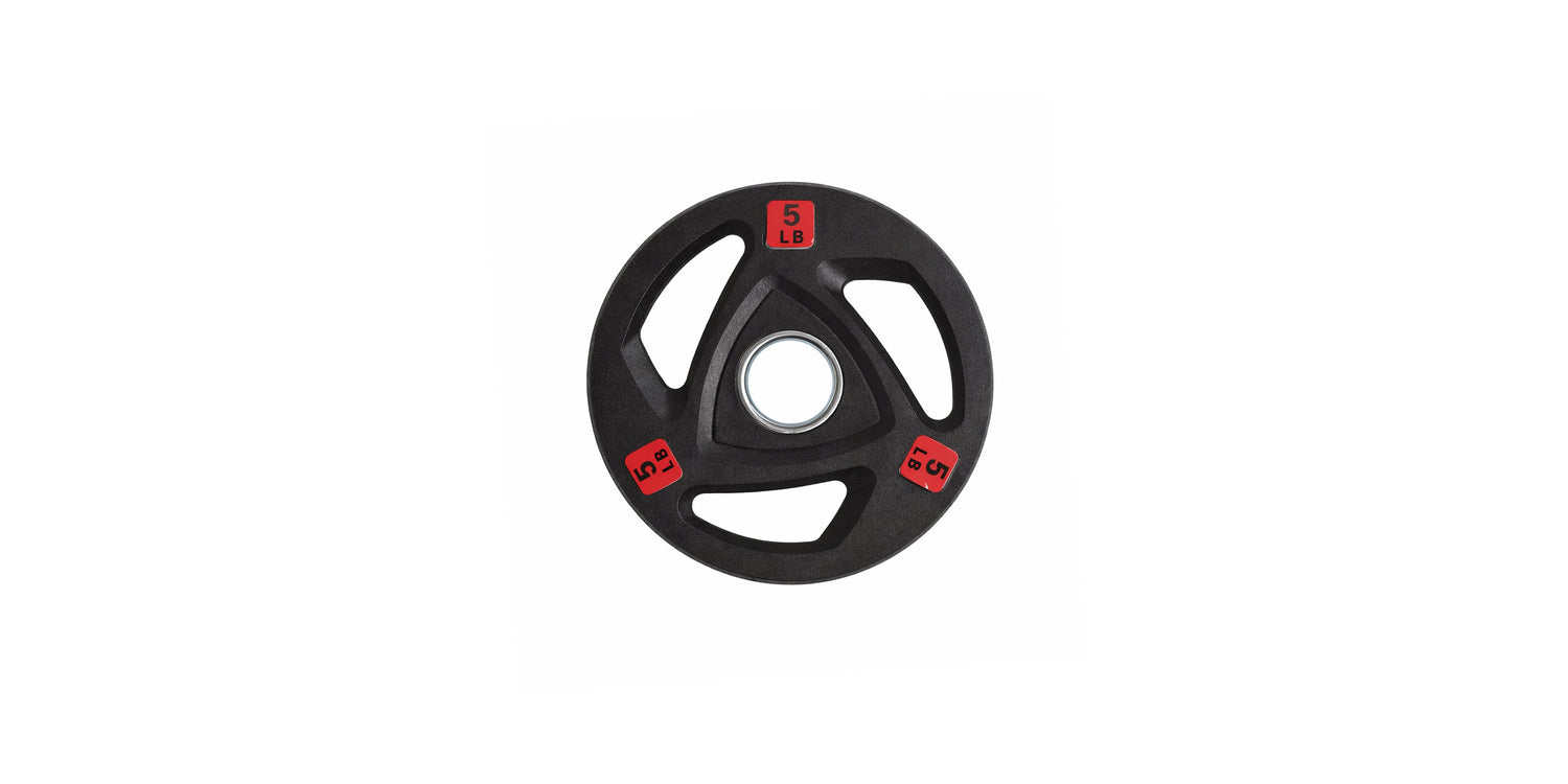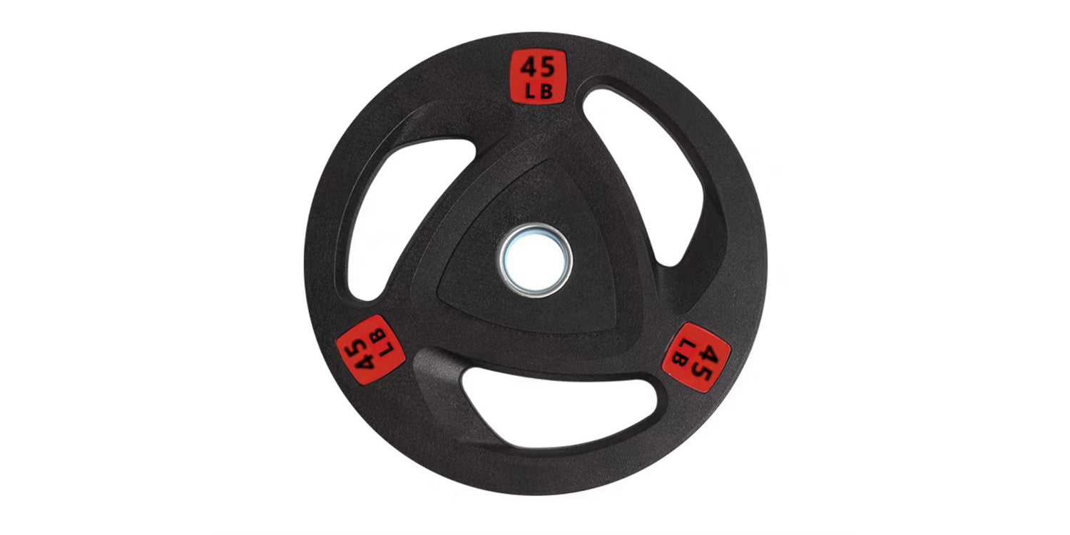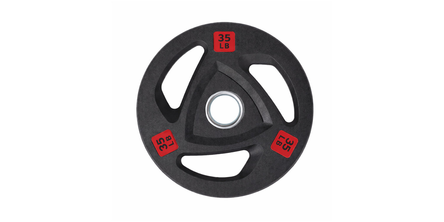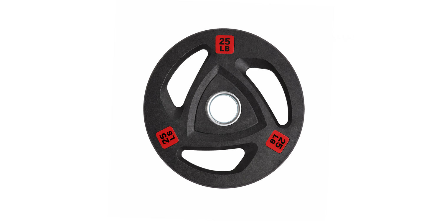 Heavy-duty Olympic plate with a balanced design and secure grip handles, built for steady lifts and versatile strength exercises.