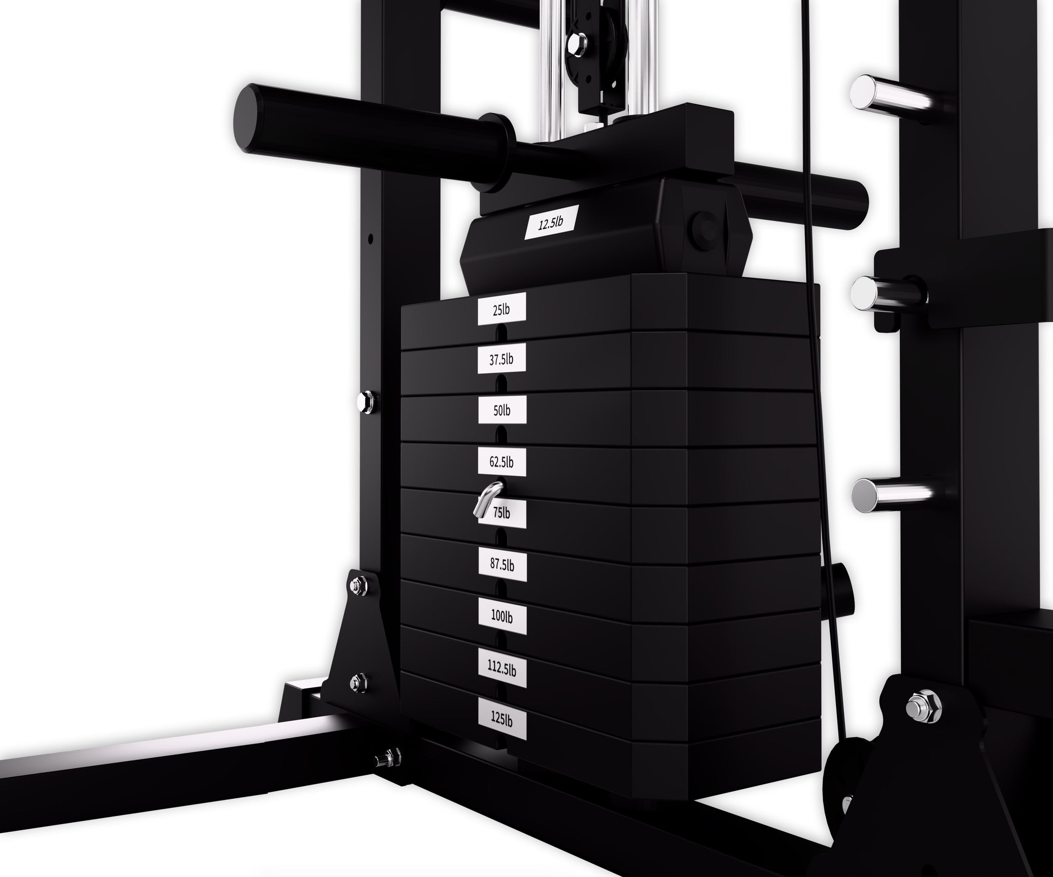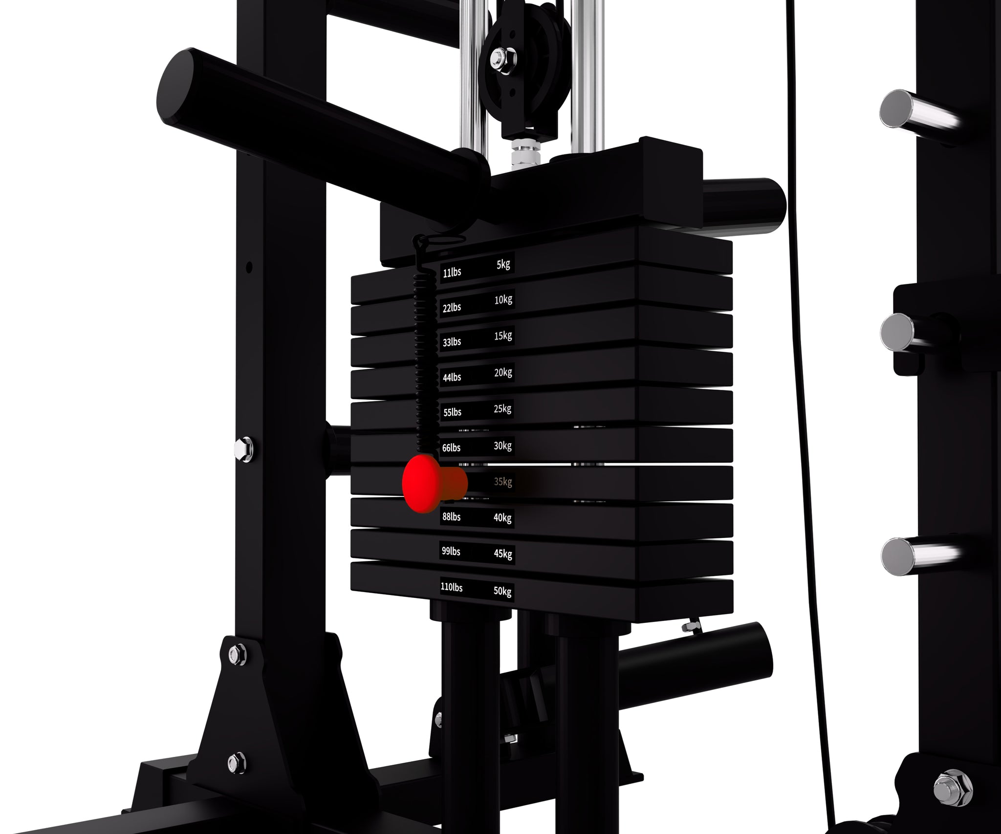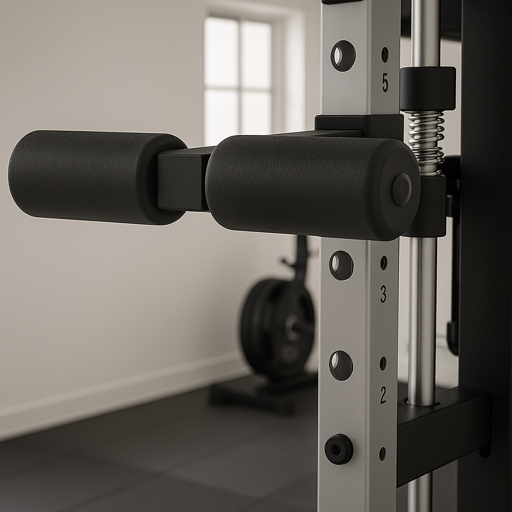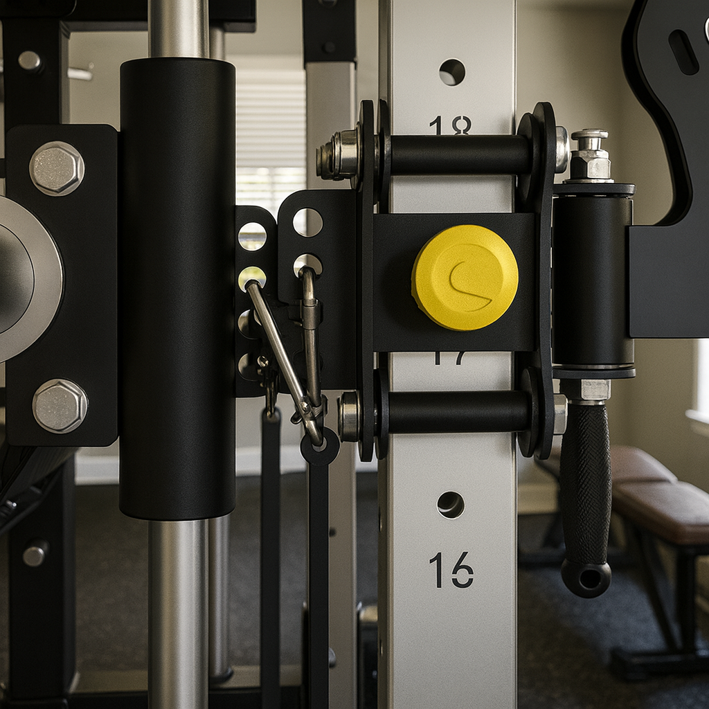 Keep your J-Hooks and Safety Bars neatly stored on the back pole, ensuring your space stays organized and clear while performing pulley workouts.