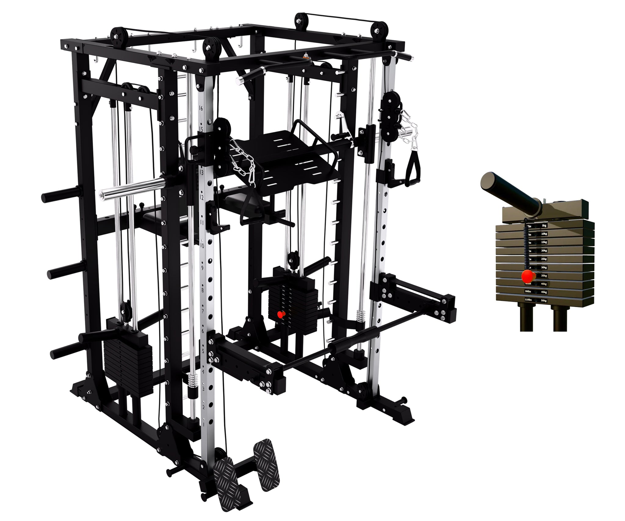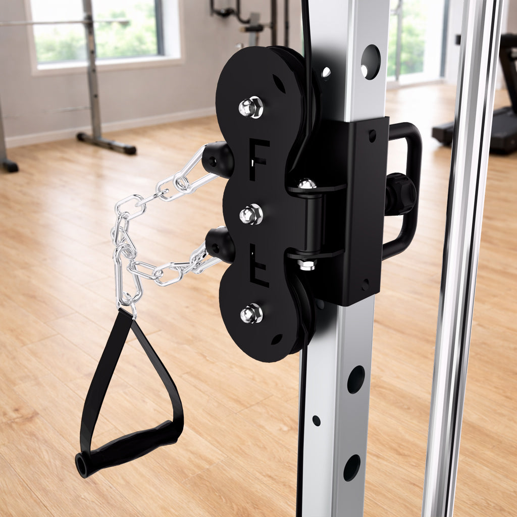 This machine features both 1:1 and 2:1 pulley ratios. The 1:1 setting delivers true, direct resistance for heavy strength training, while the 2:1 setting provides smoother movement and reduced load for better control and extended range of motion