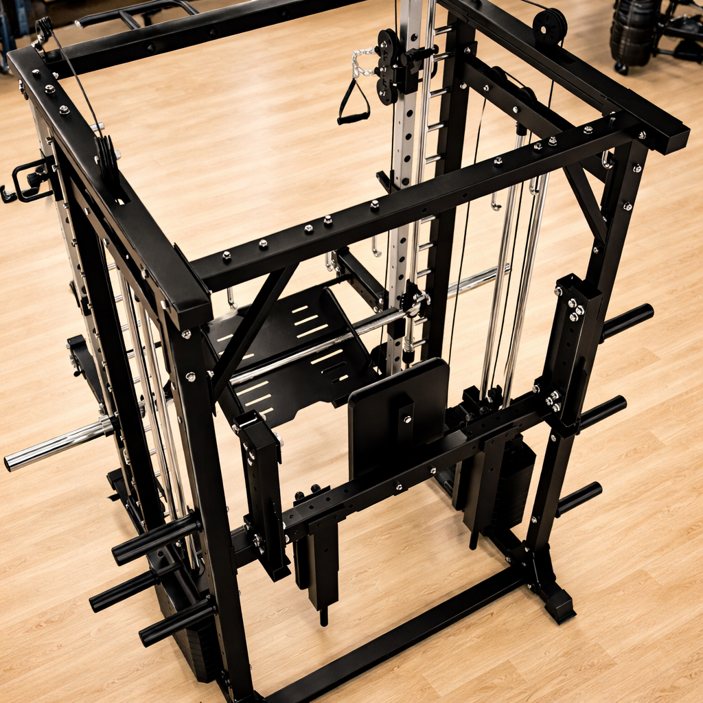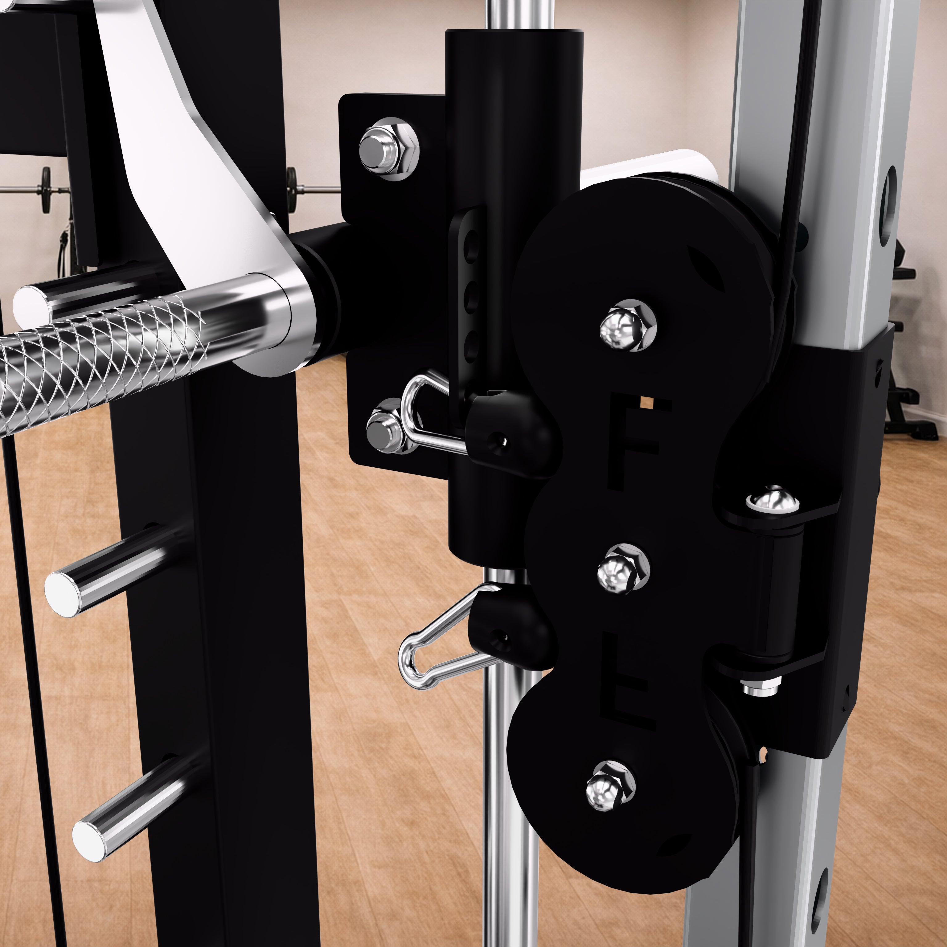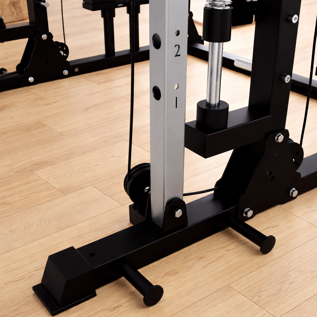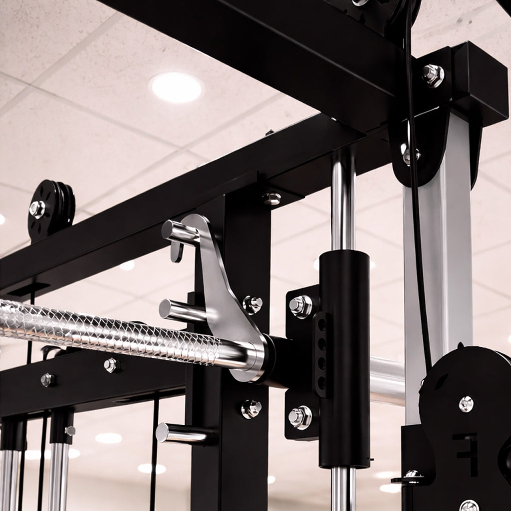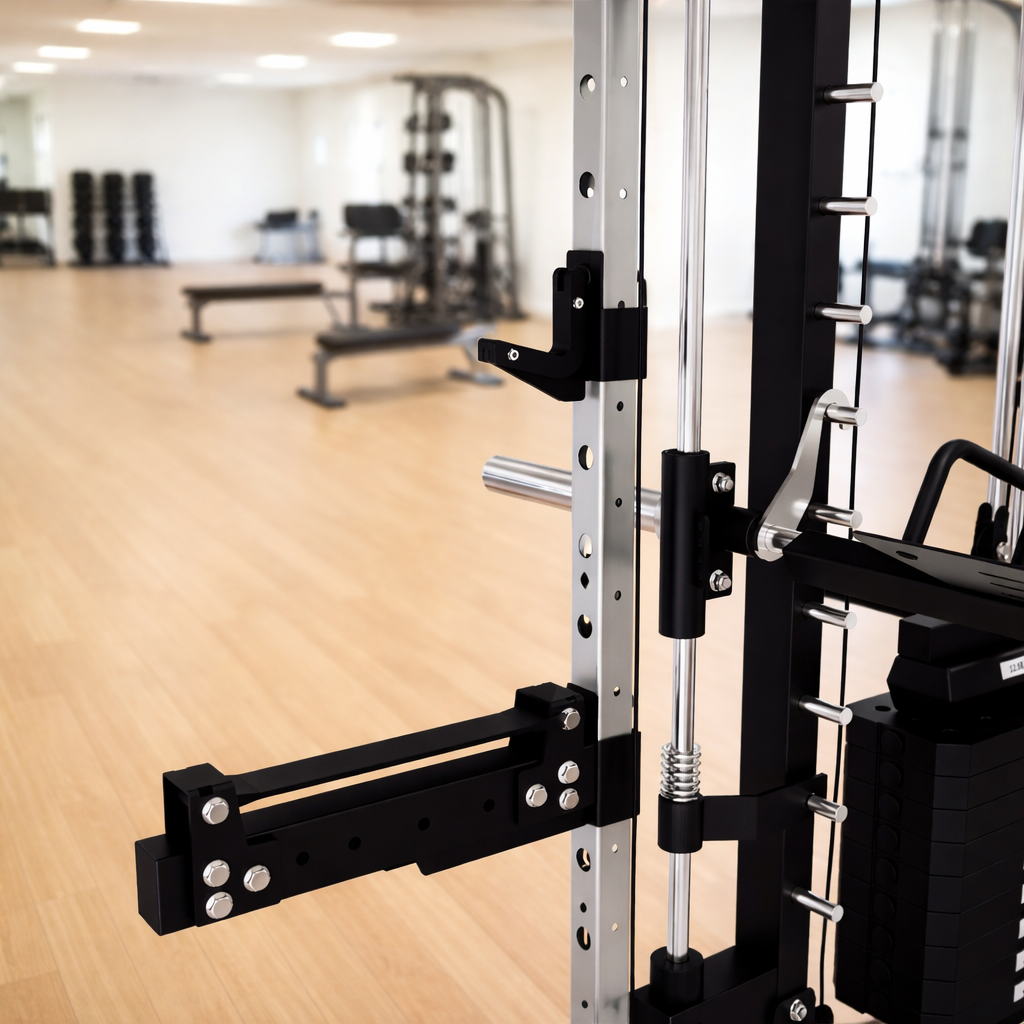 Move the Smith bar to the highest hook and lock it securely to create more open floor space and a cleaner workout area.