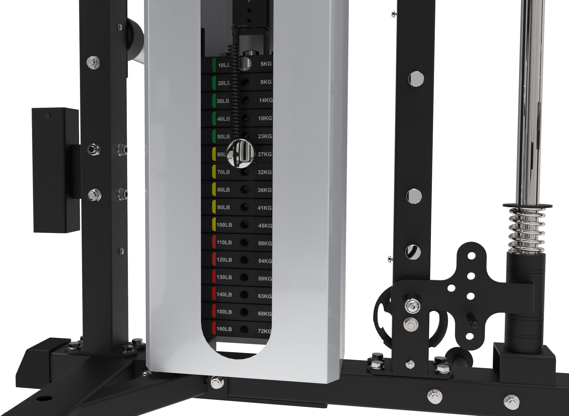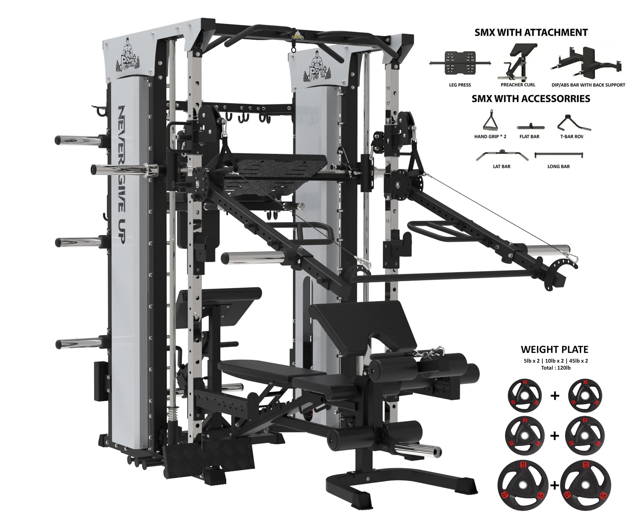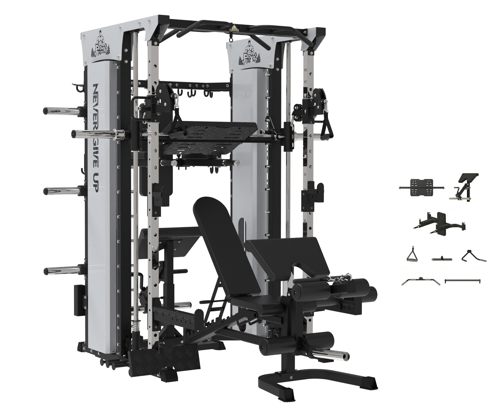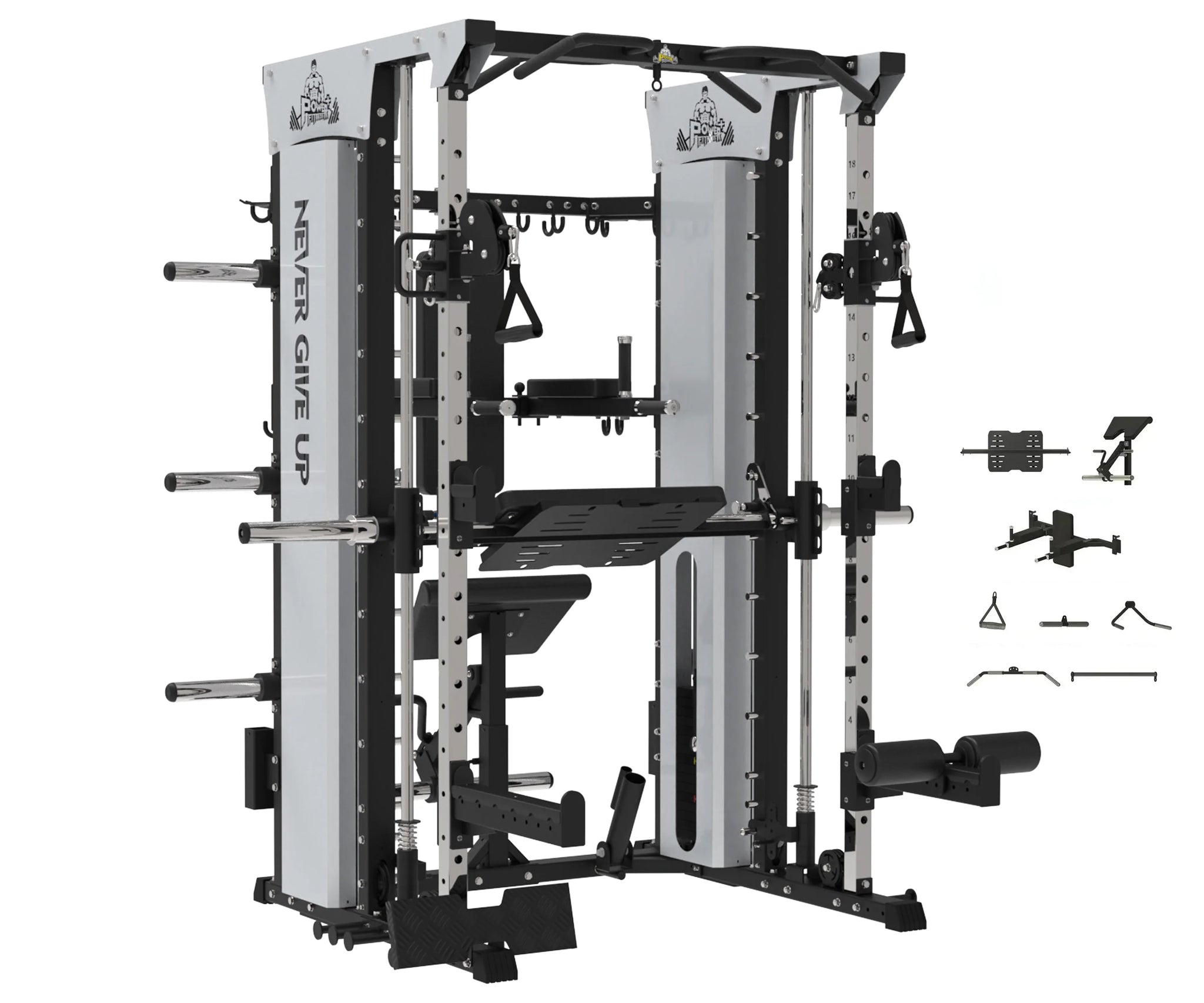 - ACCESSORIES: This professional smith machine is thoughtfully curated to include an extensive array of accessories. It comes with preacher curl, leg press, smith bar, pull-up bar, lat pulldown, dip/abs attachment, landmine, safety hook, J-hooks, safety bar, adjustable pulley, rod protector, landmine and footrest.